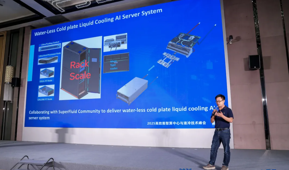 在技術研討環節,安擎技術中心副總裁發表了題為《超流體技術助力Water-Less AI液冷服器系統創新實踐》的主題演講,對安擎液冷服務器旗艦產品進行了介紹,并在闡述液冷創新方案中指出:“超流體液冷技術不僅能有效突破高功耗芯片散熱難題,還通過降低冷卻系統能耗,助力數據中心PUE值穩步降低至1.1以下。” 他進一步介紹,Water-Less AI液冷服務器系統通過超流體液冷技術的應用與AI服務器的優化設計,能夠有效應對1500W以上處理器的散熱需求,旨在顯著提升系統散熱效率與算力密度,為高性能計算提供新的解決方案。此次分享內容務實,基于安擎在液冷技術領域的持續探索,獲得了與會者的廣泛關注。